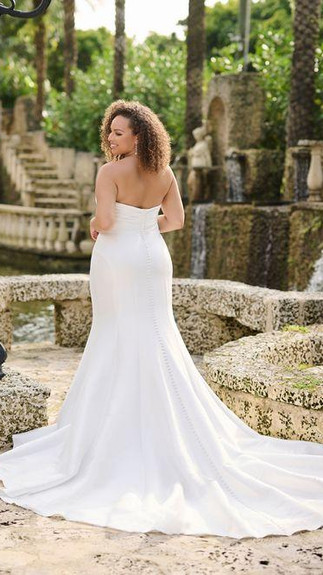 This dressed was "architecturally inspired" with a structured bodice, clean lines and elegant, flattering fit. We love that although the dress looks quite stiff, the secret sauce is the luxurious, stretch fabric that breathes along with you. You'll be comfortable but also feel secure as you dance the night away. We love the bold choice of strapless. However, talk to your consultant if you want the option of detachable sleeves for the bride who desires a bit more fabric at the arms.